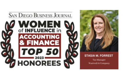 Stasia Forrest, Tax Manager at Wastvedt & Company, was recently recognized as one of the Top 50 Women of Influence in Accounting & Finance.  The prestigious award from the San Diego Business Journal is for 2023 and recognizes her outstanding work in the industry.